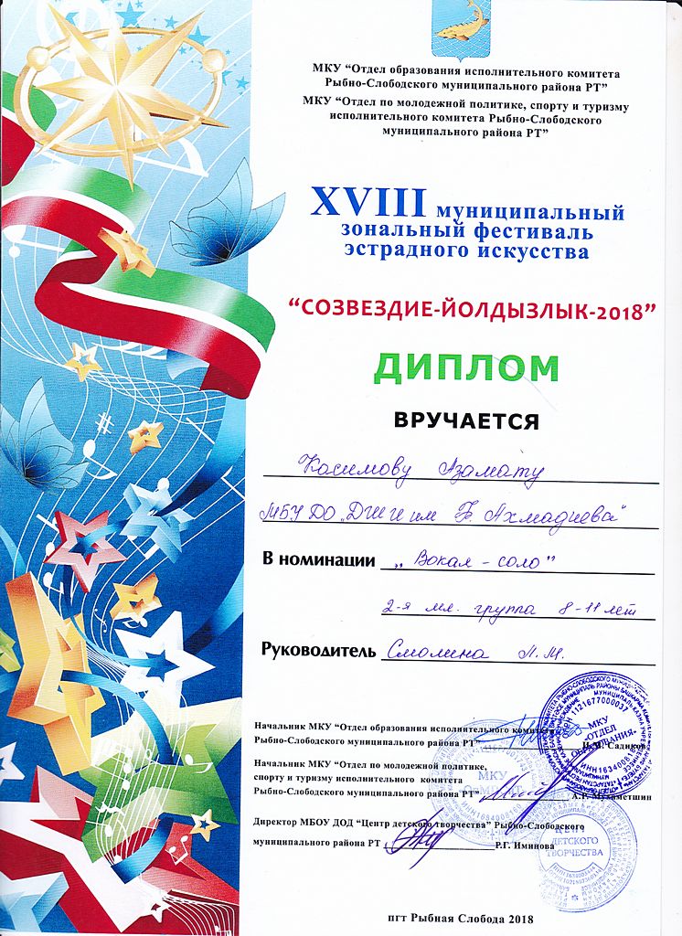 Касимов Азмат - Диплом участника муниципального этапа XVIII-го Открытого республиканского телевизионного молодежного фестиваля эстрадного искусства«Созвездие-Йолдызлык-2018» в номинации "Вокал-соло. 2-я мл. группа 8-11 лет"(февраль 2018г.)