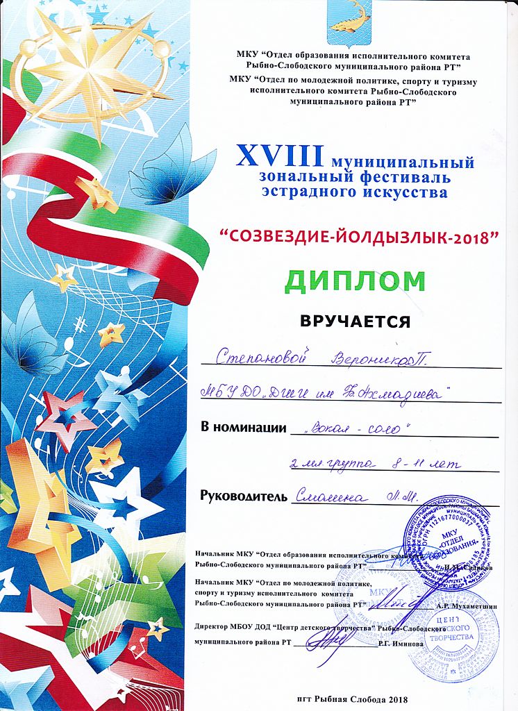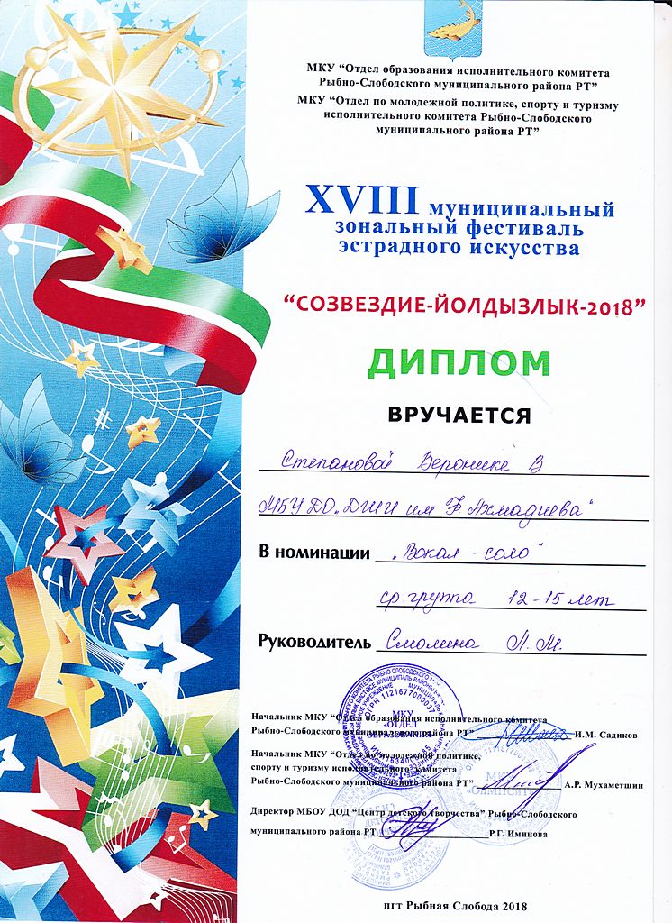 Степанова Вероника - Диплом участника муниципального этапа XVIII-го Открытого республиканского телевизионного молодежного фестиваля эстрадного искусства«Созвездие-Йолдызлык-2018» в номинации "Вокал-соло. Сред. группа12-15 лет"(февраль 2018г.)
