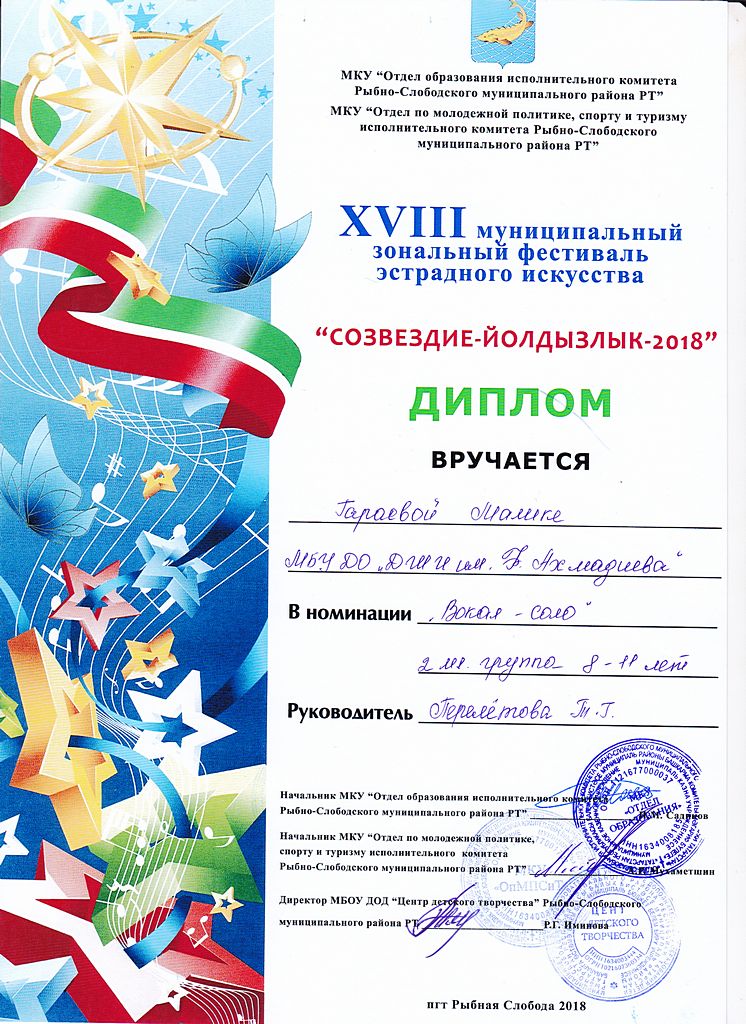 Гараева Малика - Диплом участника муниципального этапа XVIII-го Открытого республиканского телевизионного молодежного фестиваля эстрадного искусства«Созвездие-Йолдызлык-2018» в номинации "Вокал-соло. 2-я младш. группа 8-11 лет"(февраль 2018г.)