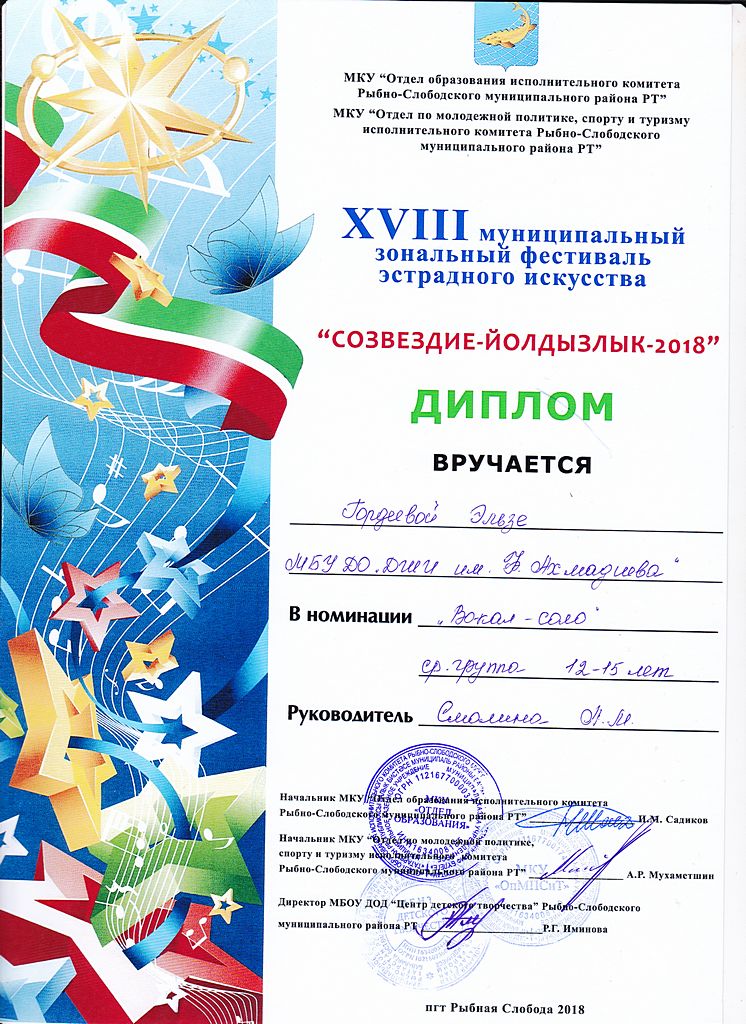 Гордеева Эльза - Диплом участника муниципального этапа XVIII-го Открытого республиканского телевизионного молодежного фестиваля эстрадного искусства«Созвездие-Йолдызлык-2018» в номинации "Вокал-соло. Средняя группа 12-15 лет"(февраль 2018г.)