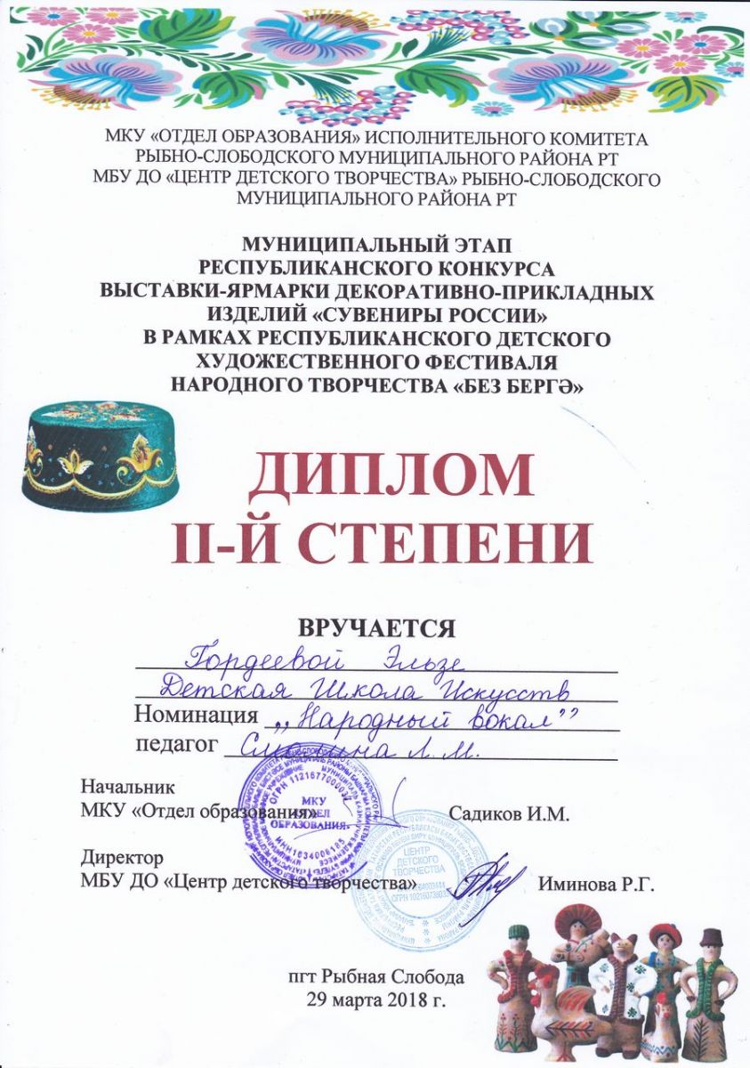 Гордеева Эльза - Диплом II-й степени муниципального этапа Респубиканского конкурса в рамках Республиканского детского художественного фестиваля народного творчества "БЕЗ БЕРГӘ" в номинации "Народный вокал" (март 2018г.)