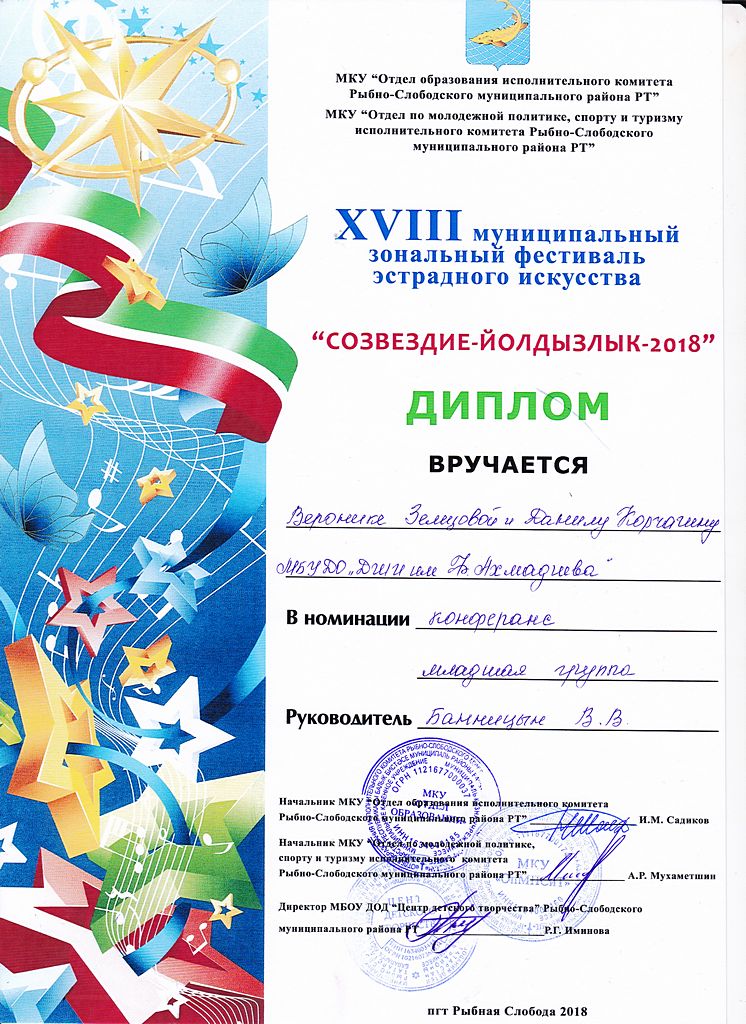 Вероника Земцова и Данил Корчагин - Диплом участника муниципального этапа XVIII-го Открытого республиканского телевизионного молодежного фестиваля эстрадного искусства«Созвездие-Йолдызлык-2018» в номинации "Конферанс. Мл. группа"(февраль 2018г.)