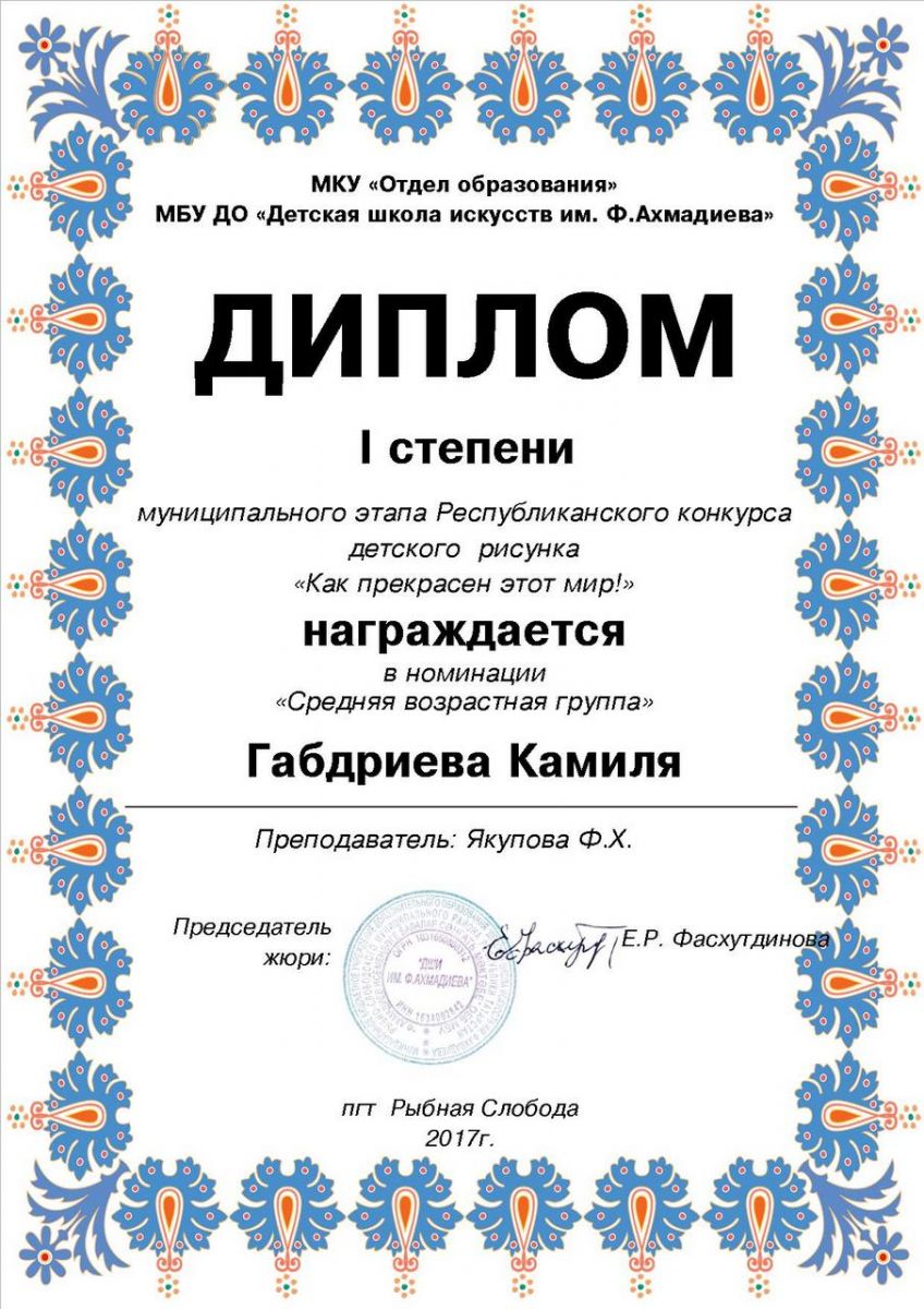 Габдриева Камиля - Диплом I-й степени муниципального этапа Республиканского конкурса детского рисунка "Как прекрасен этот мир!"в номинации "Средняя возрастная группа"(2017г.)