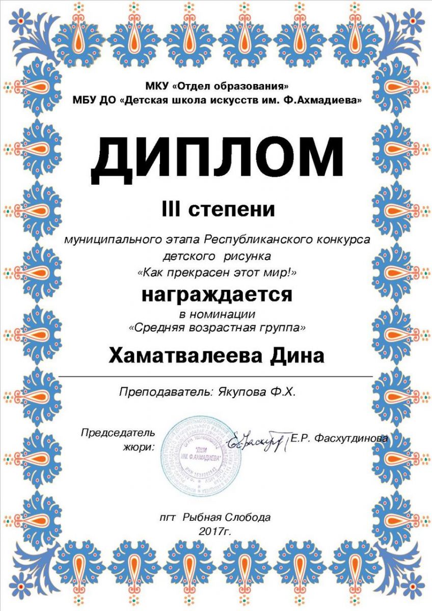 Хаматвалеева Дина - Диплом III-й степени муниципального этапа Республиканского конкурса детского рисунка "Как прекрасен этот мир!"в номинации "Средняя возрастная группа"(2017г.)