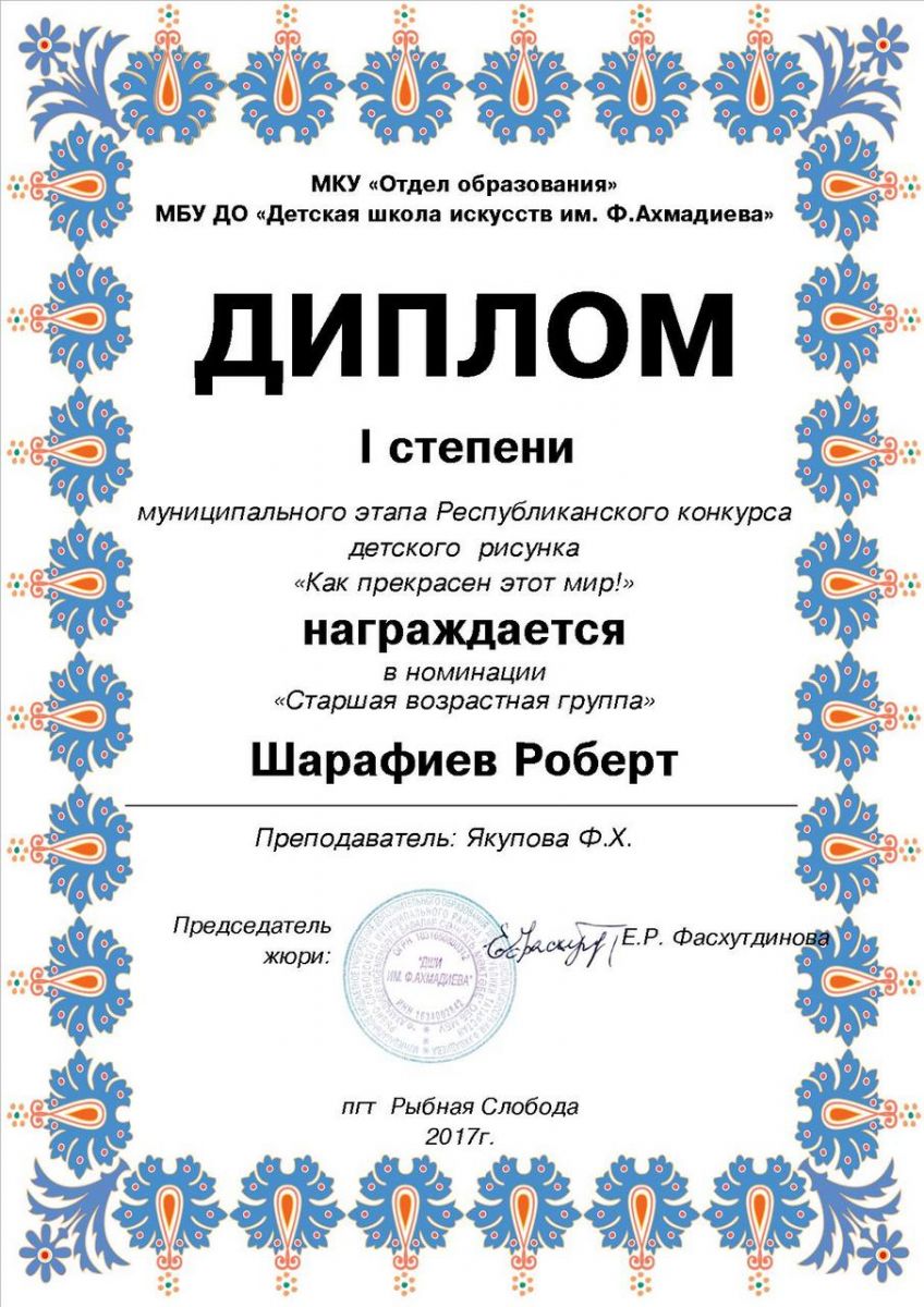 Шарафиев Роберт - Диплом I-й степени муниципального этапа Республиканского конкурса детского рисунка "Как прекрасен этот мир!"в номинации "Старшая возрастная группа"(2017г.)