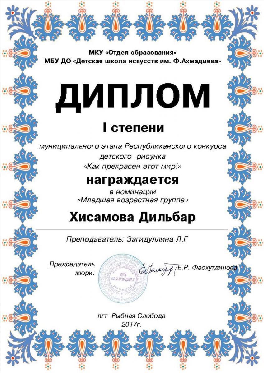Хисамова Дильбар - Диплом I-й степени муниципального этапа Республиканского конкурса детского рисунка "Как прекрасен этот мир!"в номинации "Младшая возрастная группа"(2017г.)