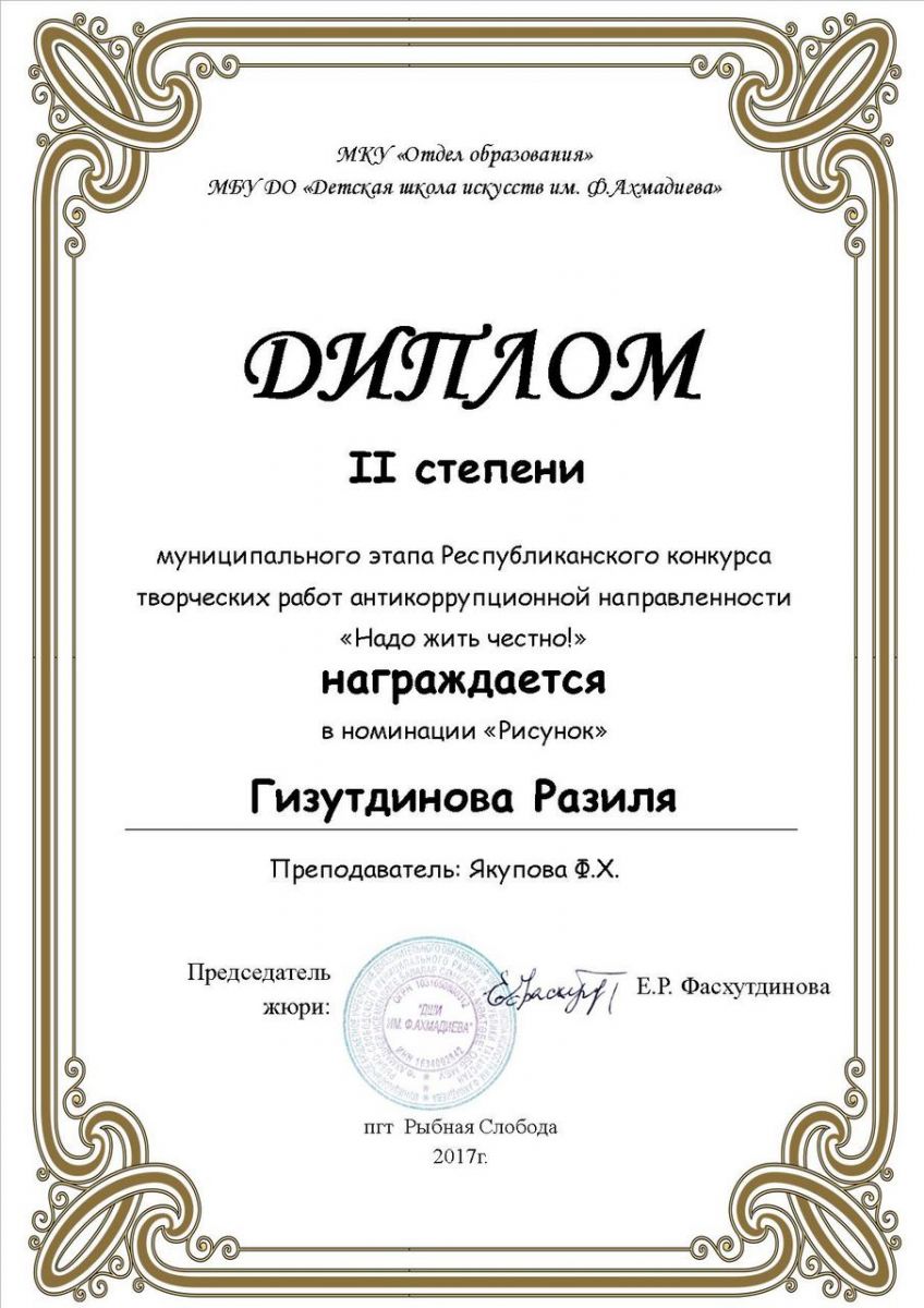 Гизутдинова Разиля - Диплом II-й степени муниципального этапа Республиканского конкурса творческих работ антикоррупционной направленности "Надо жить честно!" в номинации "Рисунок"(2017г.)