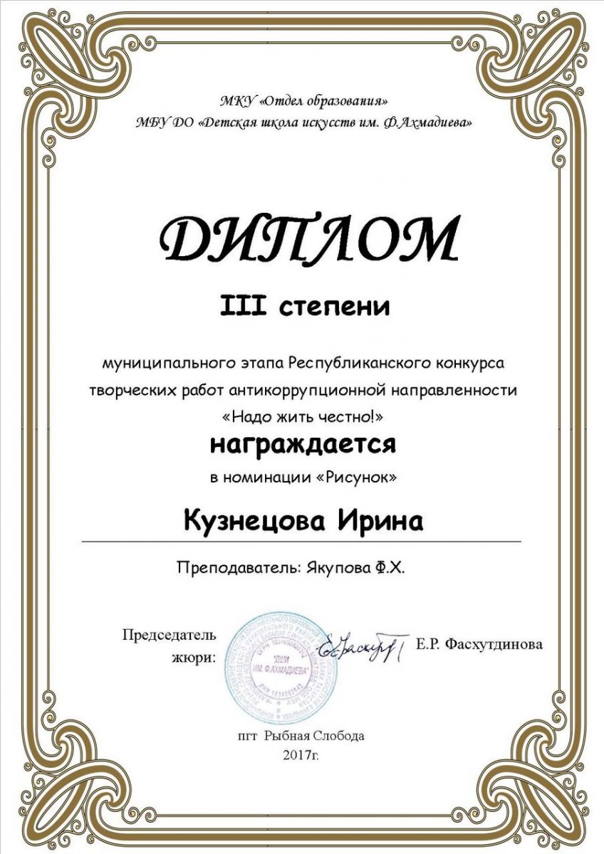 Кузнецова Ирина - Диплом III-й степени муниципального этапа Республиканского конкурса творческих работ антикоррупционной направленности "Надо жить честно!" в номинации "Рисунок"(2017г.)