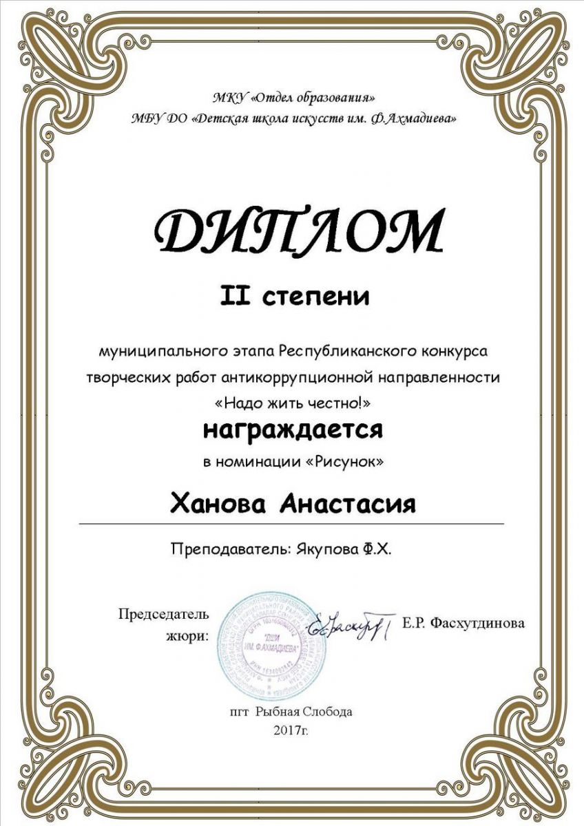 Ханова Анастасия - Диплом II-й степени муниципального этапа Республиканского конкурса творческих работ антикоррупционной направленности "Надо жить честно!" в номинации "Рисунок"(2017г.)