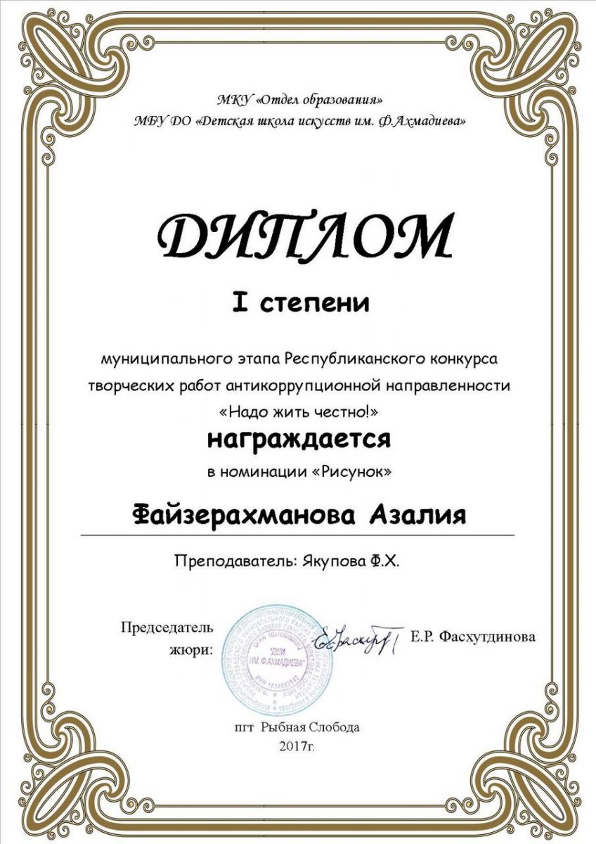 Файзерахманова Азалия - Диплом I-й степени муниципального этапа Республиканского конкурса творческих работ антикоррупционной направленности "Надо жить честно!" в номинации "Рисунок"(2017г.)