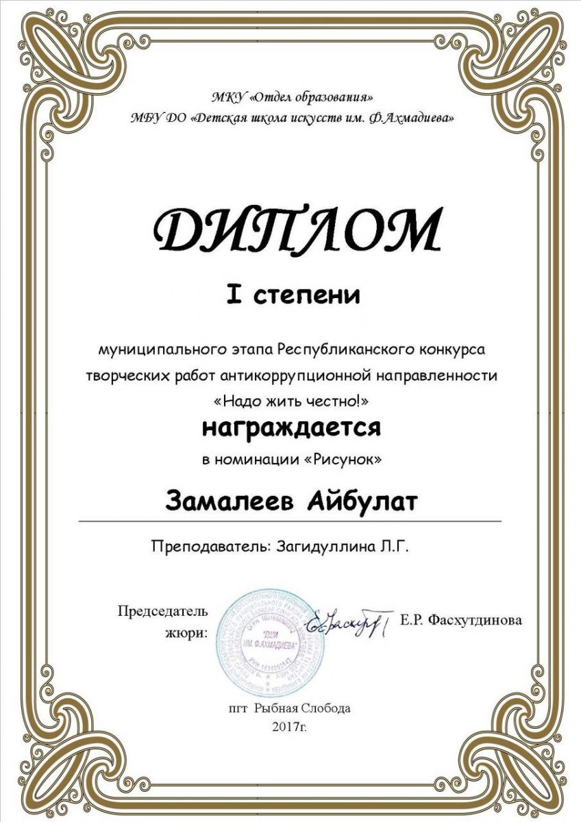 Замалеев Айбулат - Диплом II-й степени муниципального этапа Республиканского конкурса творческих работ антикоррупционной направленности "Надо жить честно!" в номинации "Рисунок"(2017г.)