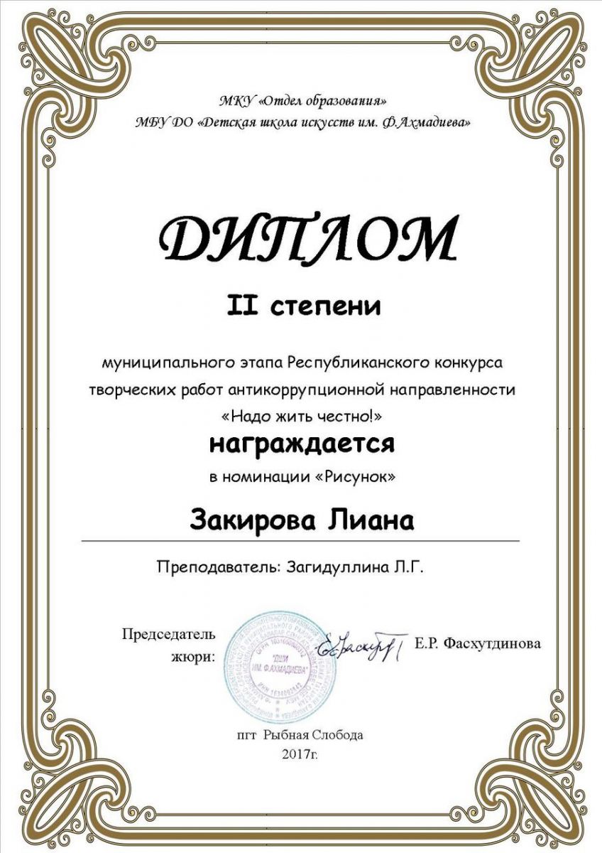 Закирова Лиана - Диплом II-й степени муниципального этапа Республиканского конкурса творческих работ антикоррупционной направленности "Надо жить честно!" в номинации "Рисунок"(2017г.)