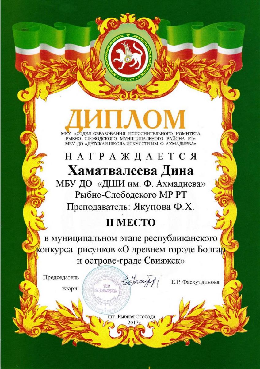 Хаматваеева Дина - Диплом II-й степени муниципального этапа Республиканского конкурса "О древнем городе Болгар и острове-граде Свияжск"(2017г.)