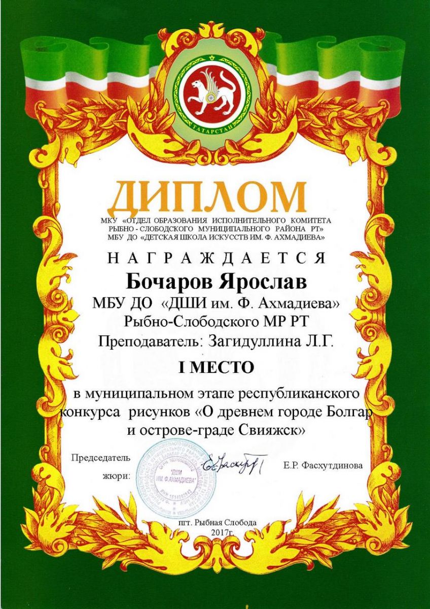 Бочаров Ярослав - Диплом I-й степени муниципального этапа Республиканского конкурса "О древнем городе Болгар и острове-граде Свияжск"(2017г.)
