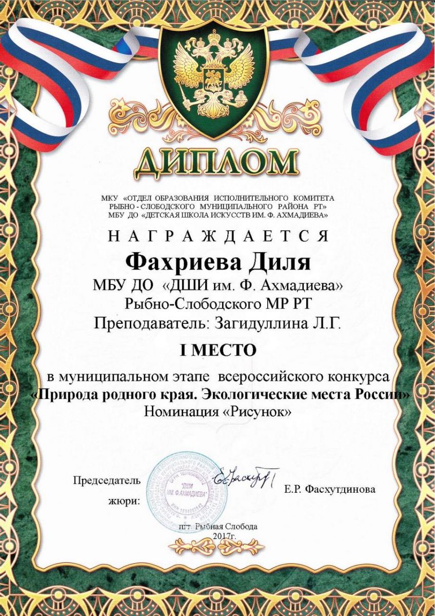 Фахриева Диля - Диплом I-й степени муниципального этапа Всероссийского конкурса "Природа родного края. Экологические места России" в номинации "Рисунок"(2017г.)