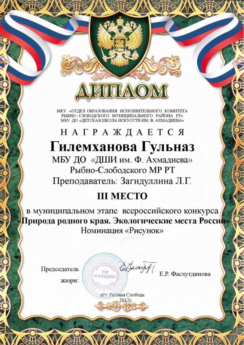 Гилемханова Гульназ - Диплом III-й степени муниципального этапа Всероссийского конкурса "Природа родного края. Экологические места России" в номинации "Рисунок"(2017г.)