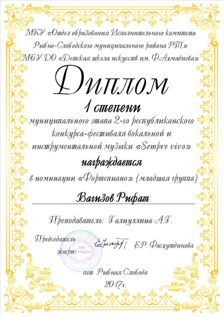 Вагизов Рифат - Диплом I-й степени муниципального этапа II-го Республиканского конкурса-фестиваля вокальной и инструментальной классической музыки "Sempre vivo" в номинации "Фортепиано. Младшая группа"(ноябрь 2017г.)