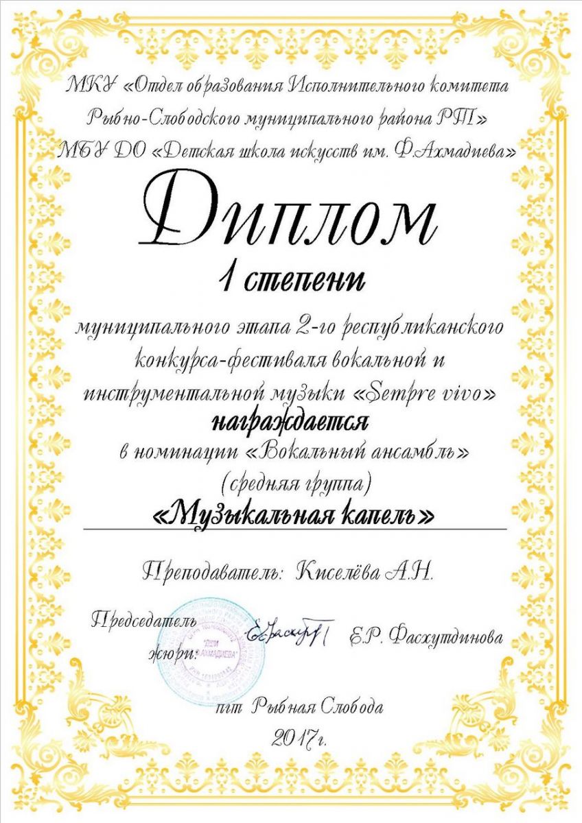 "Музыкальная капель" - Диплом I-й степени муниципального этапа II-го Республиканского конкурса-фестиваля вокальной и инструментальной классической музыки "Sempre vivo" в номинации "Вокальный ансамбль. Средняя группа"(ноябрь 2017г.)