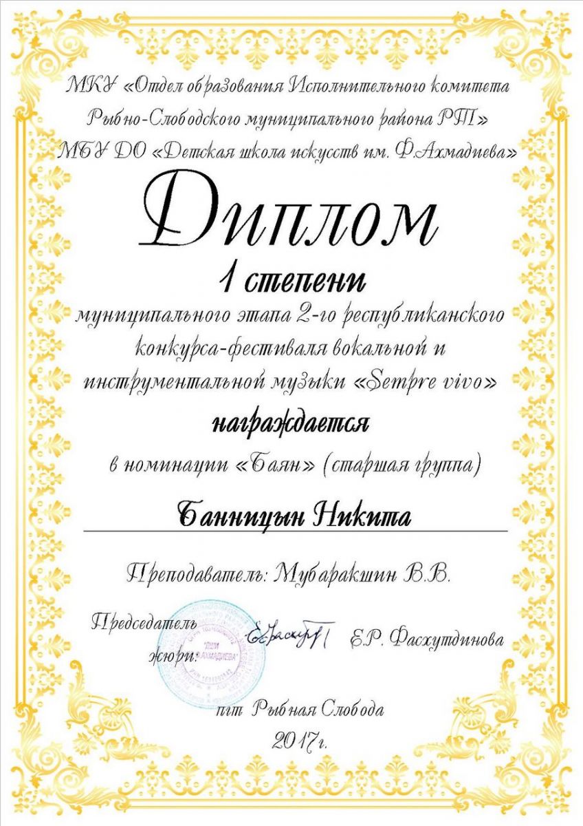 Банницын Никита - Диплом I-й степени муниципального этапа II-го Республиканского конкурса-фестиваля вокальной и инструментальной классической музыки "Sempre vivo" в номинации "Баян. Старшая группа"(ноябрь 2017г.)