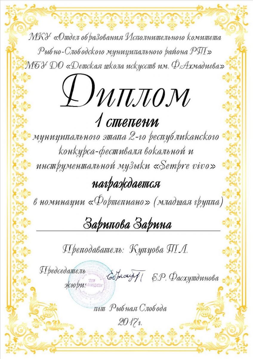 Зарипова Зарина - Диплом I-й степени муниципального этапа II-го Республиканского конкурса-фестиваля вокальной и инструментальной классической музыки "Sempre vivo" в номинации "Фортепиано. Младшая группа"(ноябрь 2017г.)