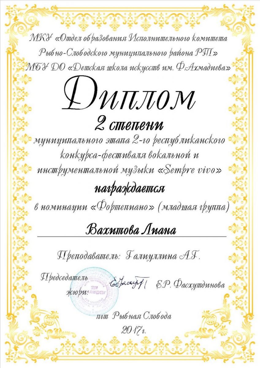 Вахитова Лиана - Диплом II-й степени муниципального этапа II-го Республиканского конкурса-фестиваля вокальной и инструментальной классической музыки "Sempre vivo" в номинации "Фортепиано. Младшая группа"(ноябрь 2017г.)