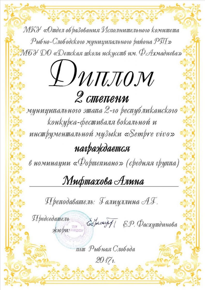 Мифтахова Алина - Диплом II-й степени муниципального этапа II-го Республиканского конкурса-фестиваля вокальной и инструментальной классической музыки "Sempre vivo" в номинации "Фортепиано. Средняя группа"(ноябрь 2017г.)