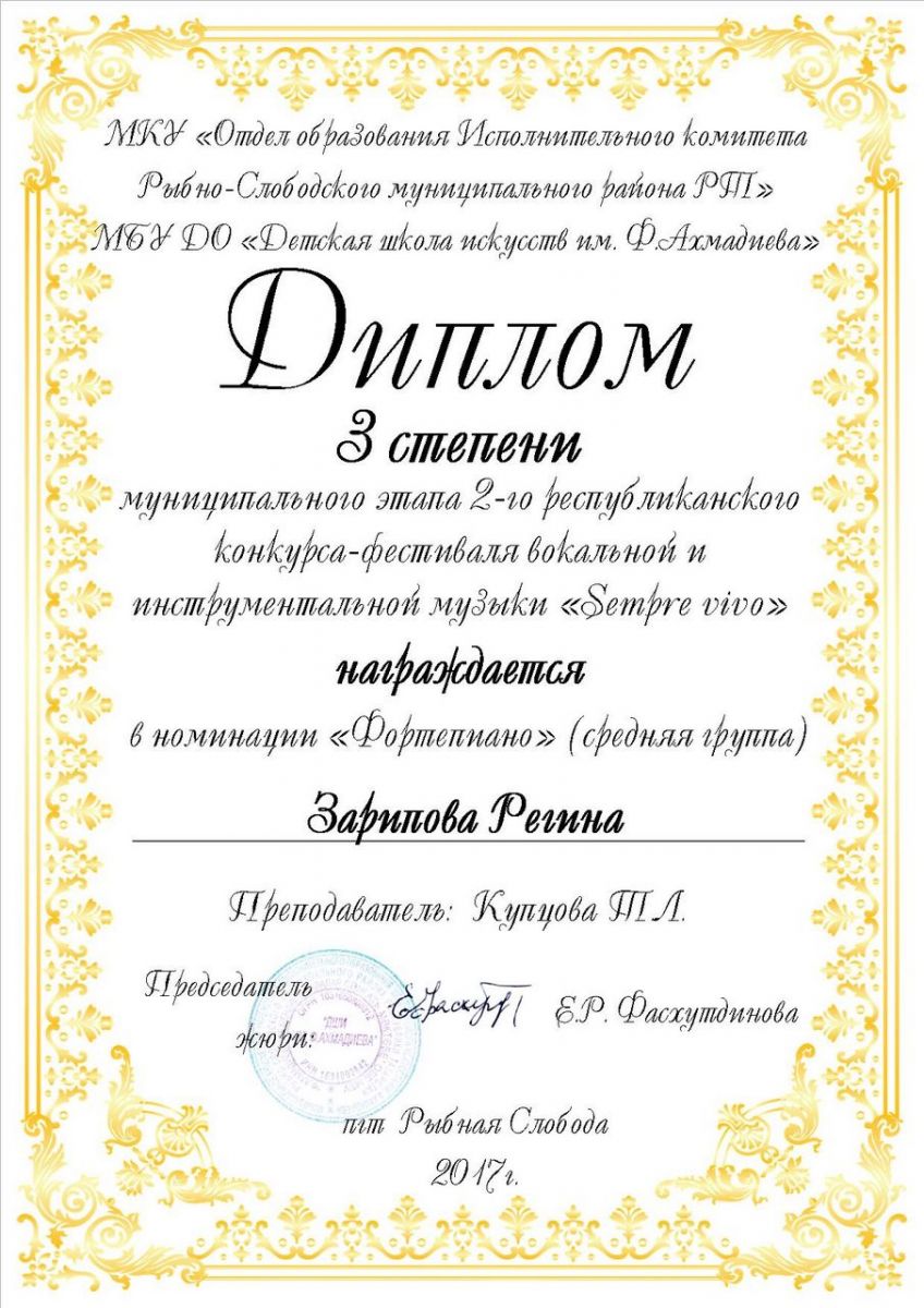 Зарипова Регина - Диплом III-й степени муниципального этапа II-го Республиканского конкурса-фестиваля вокальной и инструментальной классической музыки "Sempre vivo" в номинации "Фортепиано. Средняя группа"(ноябрь 2017г.)