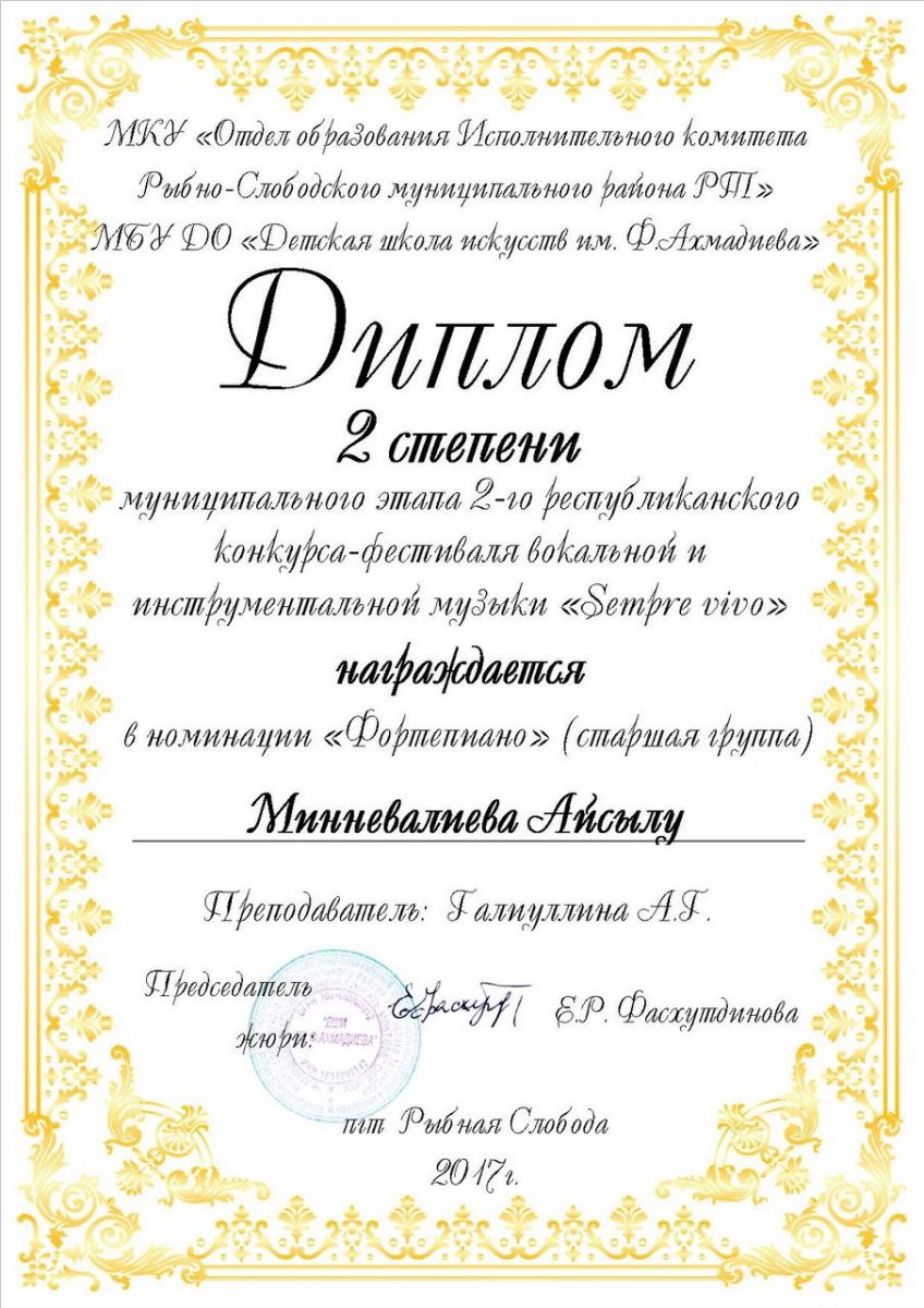 Минневалиева Айсылу - Диплом II-й степени муниципального этапа II-го Республиканского конкурса-фестиваля вокальной и инструментальной классической музыки "Sempre vivo" в номинации "Фортепиано. Старшая группа"(ноябрь 2017г.)