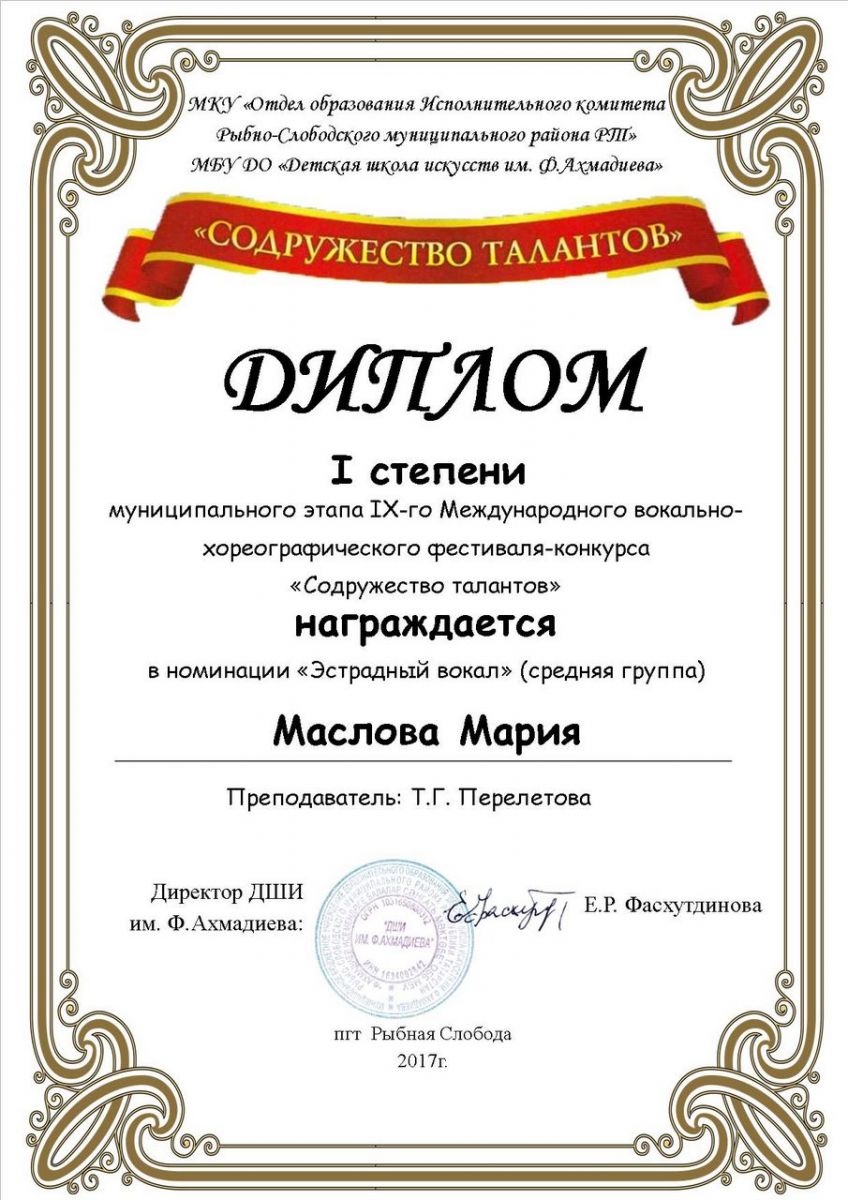 Маслова Мария - Диплом I-й степени муниципального этапа IX-го Международного вокально-хореографического фестиваля-конкурса "Содружество талантов" в номинации "Эстрадный вокал. Средняя группа" (октябрь 2017г.)