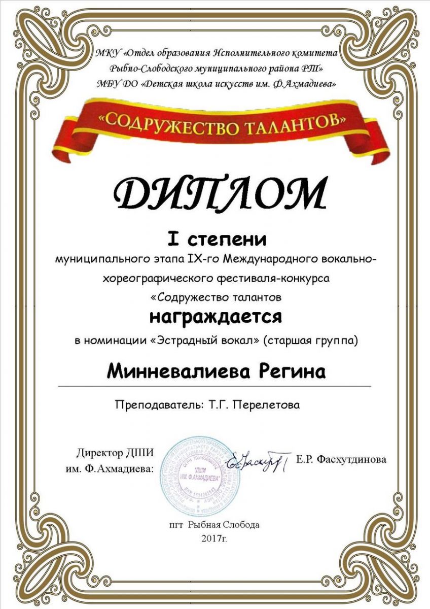 Минневалиева Регина - Диплом I-й степени муниципального этапа IX-го Международного вокально-хореографического фестиваля-конкурса "Содружество талантов" в номинации "Эстрадный вокал. Старшая группа" (октябрь 2017г.)