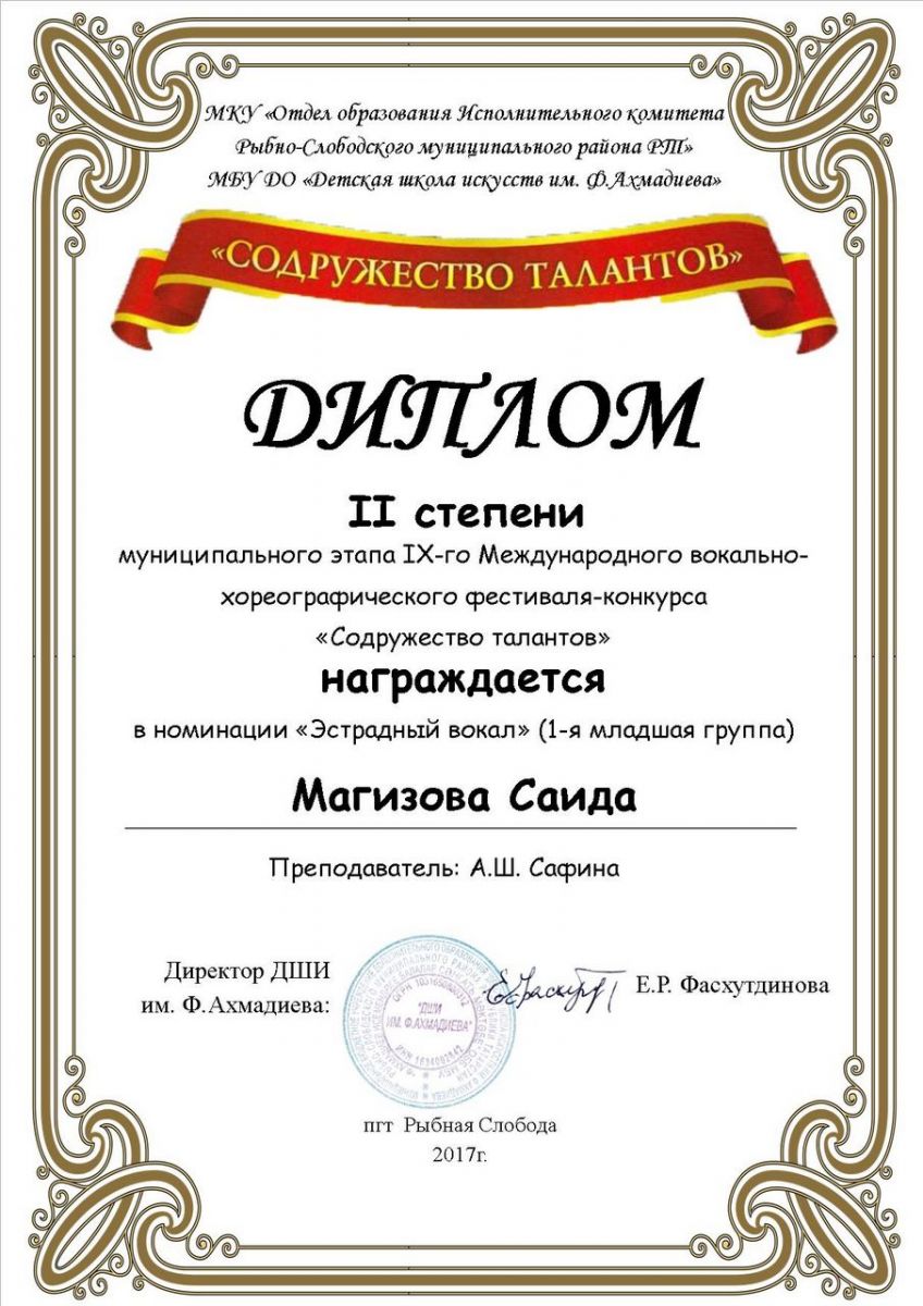 Магизова Саида - Диплом II-й степени муниципального этапа IX-го Международного вокально-хореографического фестиваля-конкурса "Содружество талантов" в номинации "Эстрадный вокал. 1-я младшая группа" (октябрь 2017г.)