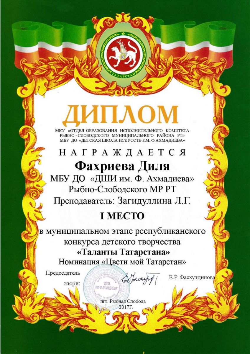 Фахриева Диля - Диплом I-й степени муниципального этапа республиканского конкурса детского творчества "Таланты Татарстана" в номинации "Цвети мой Татарстан"(2017г.)