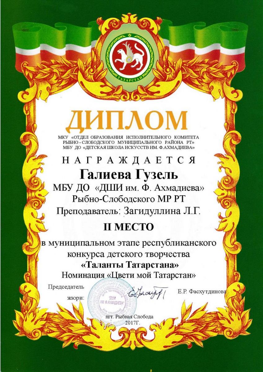 Галиева Гузель - Диплом II-й степени муниципального этапа республиканского конкурса детского творчества "Таланты Татарстана" в номинации "Цвети мой Татарстан"(2017г.)