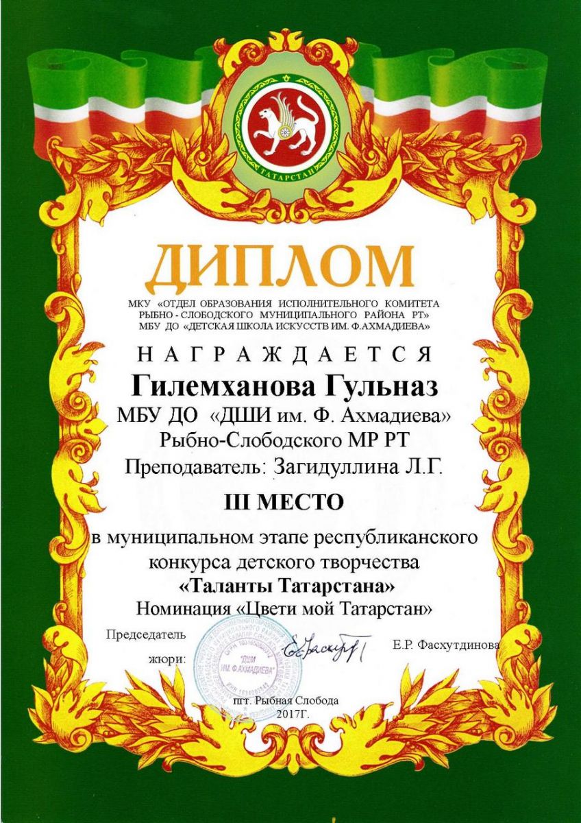 Гилемханова Гульназ - Диплом III-й степени муниципального этапа республиканского конкурса детского творчества "Таланты Татарстана" в номинации "Цвети мой Татарстан"(2017г.)