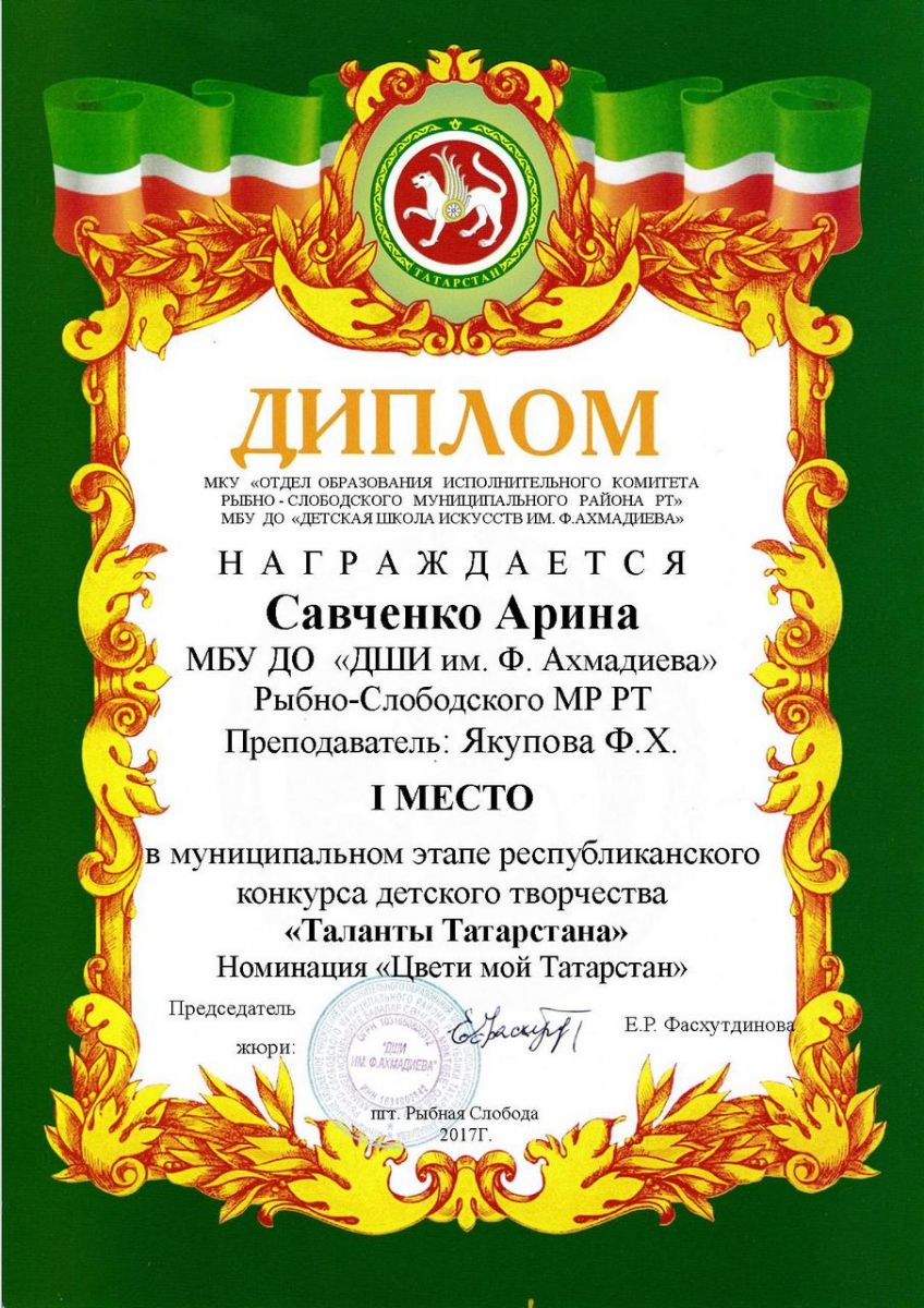 Савченко Арина - Диплом I-й степени муниципального этапа республиканского конкурса детского творчества "Таланты Татарстана" в номинации "Цвети мой Татарстан"(2017г.)
