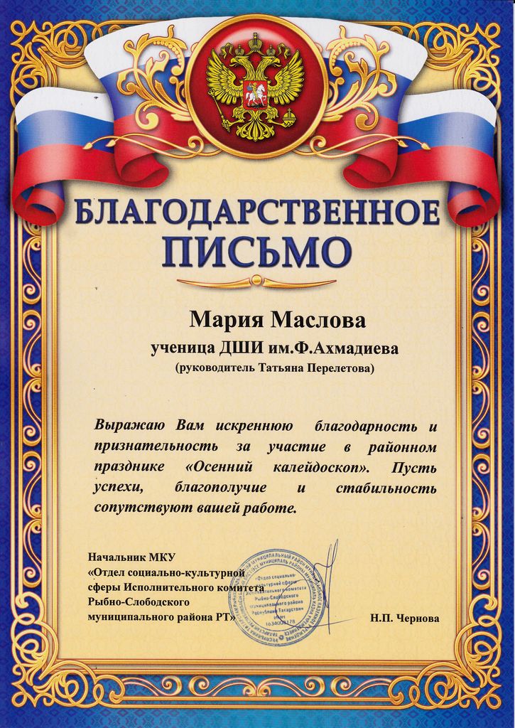Маслова Мария - Благодарственное письмо МКУ "Отдел социально-культурной сферы Исполнительного комитета Рыбно-Слободского муниципального района Республики Татарстан"