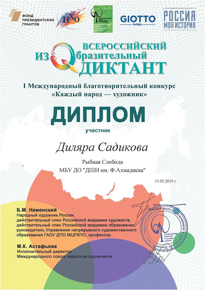 - Диляра Садикова - Диплом Всероссийского изобразительного диктаната в рамках Международного благотворительного конкурса "Каждый народ - художник" (февраль 2019г.)