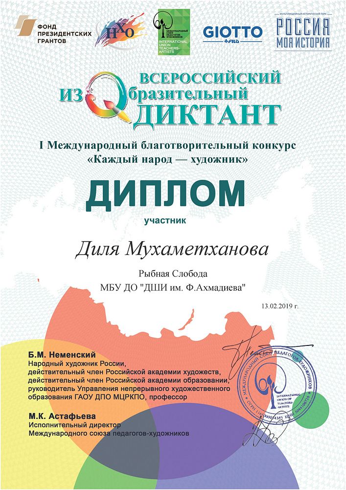 - Диля Мухаметханова - Диплом Всероссийского изобразительного диктаната в рамках Международного благотворительного конкурса "Каждый народ - художник" (февраль 2019г.)