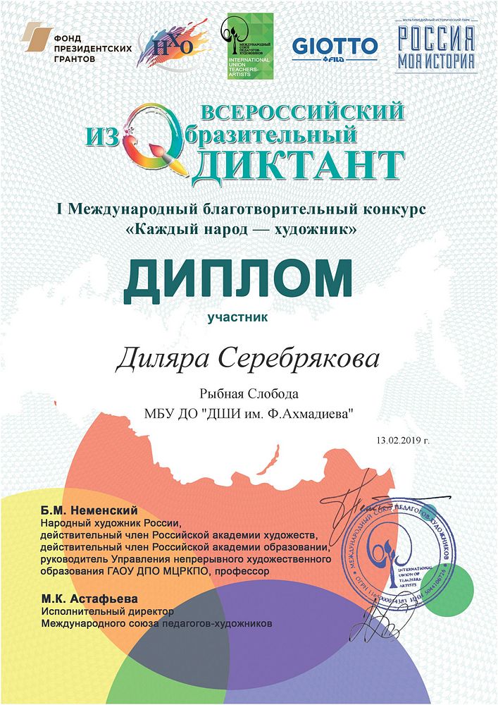- Диляра Серебрякова - Диплом Всероссийского изобразительного диктаната в рамках Международного благотворительного конкурса "Каждый народ - художник" (февраль 2019г.)