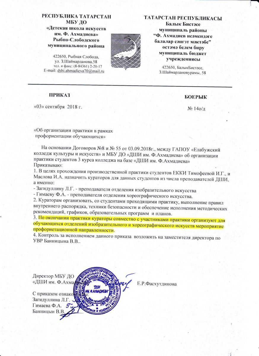 Договор с ГАПОУ "Елабужский колледж культуры и искусств" №55 об организации практики студентов