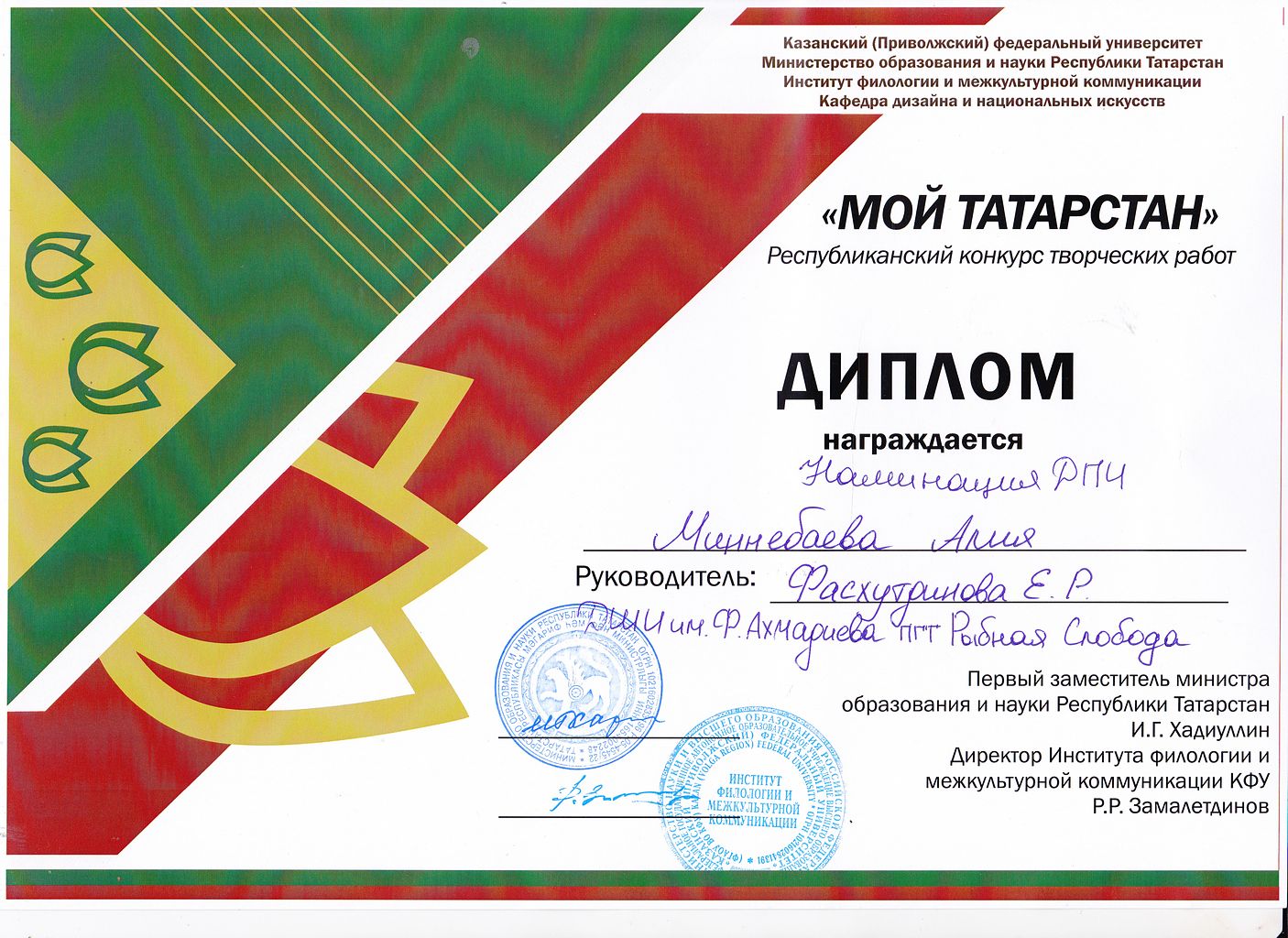 - Миннебаева Алия - Дипломант Республиканского конкурса творческих работ "Мой Татарстан" в номинации ДПИ (декабрь 2019г.)