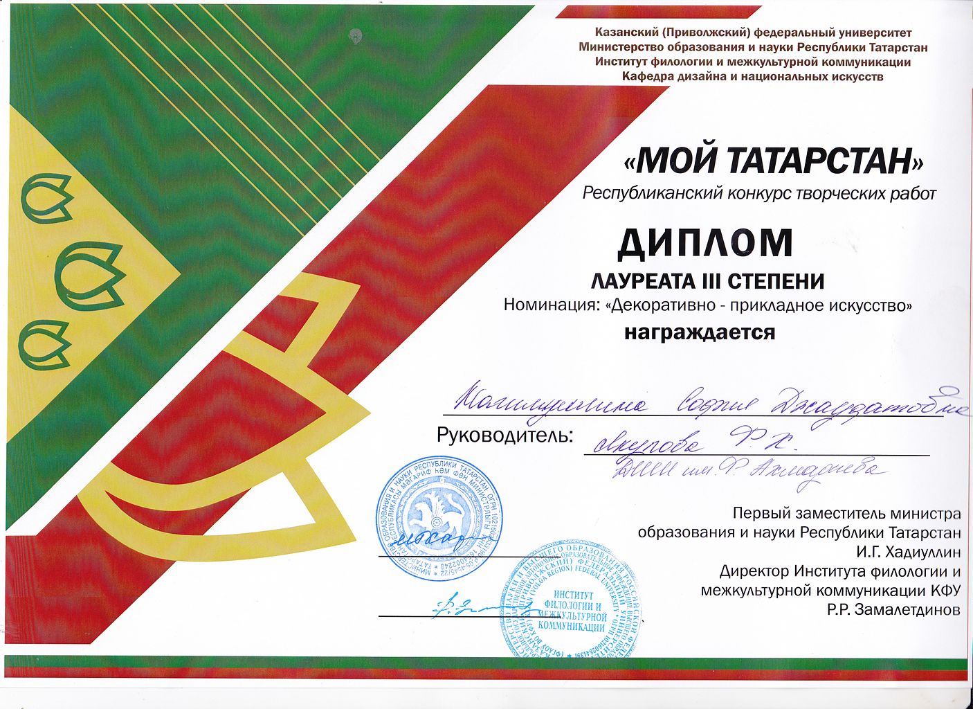 - Нагимуллина София - Диплом Лауреата III-й степени Республиканского конкурса творческих работ "Мой Татарстан" в номинации ДПИ (декабрь 2019г.)