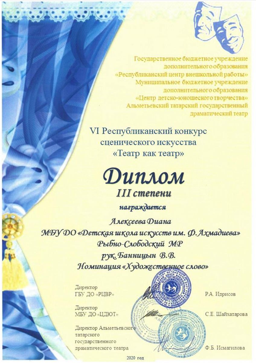 - Алексеева Диана - Диплом III-й степени VI-го Республиканского конкурса сценического искусства "Театр как театр" в номинации "Художественное слово" (апрель 2020г.)