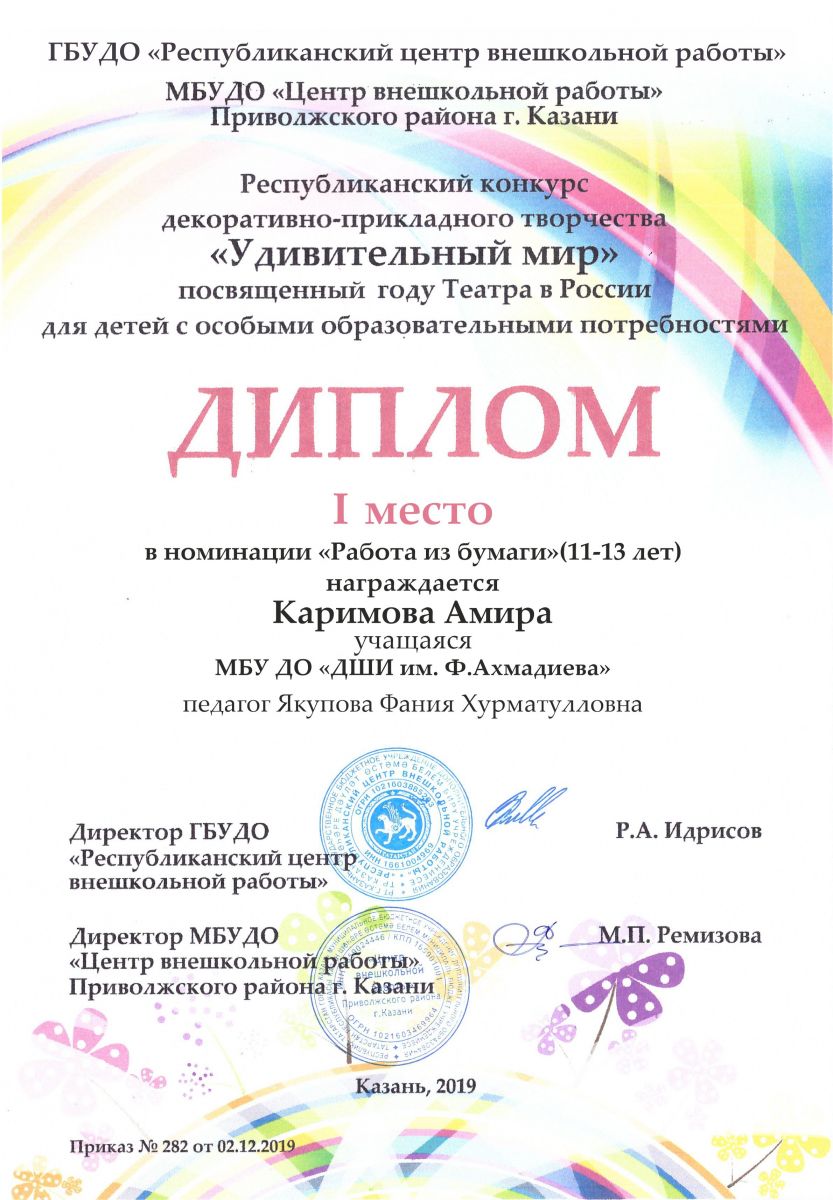 - Каримова Амира - Диплом I место Республиканского конкурса декоративно-прикладного творчества "Удивительный мир" в номинации "Работа из бумаги" (декабрь 2019г.)