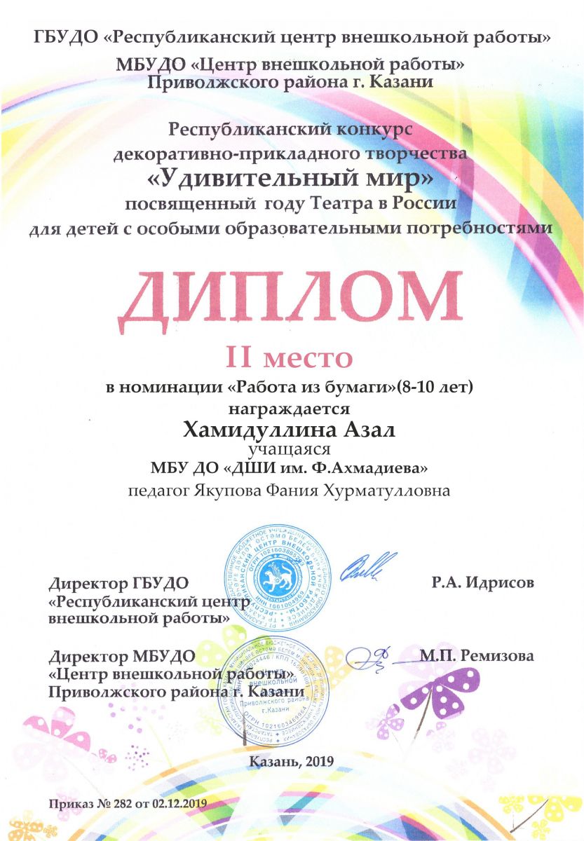- Хамидуллина Азалия - Диплом II место Республиканского конкурса декоративно-прикладного творчества "Удивительный мир" в номинации "Работа из бумаги" (декабрь 2019г.)
