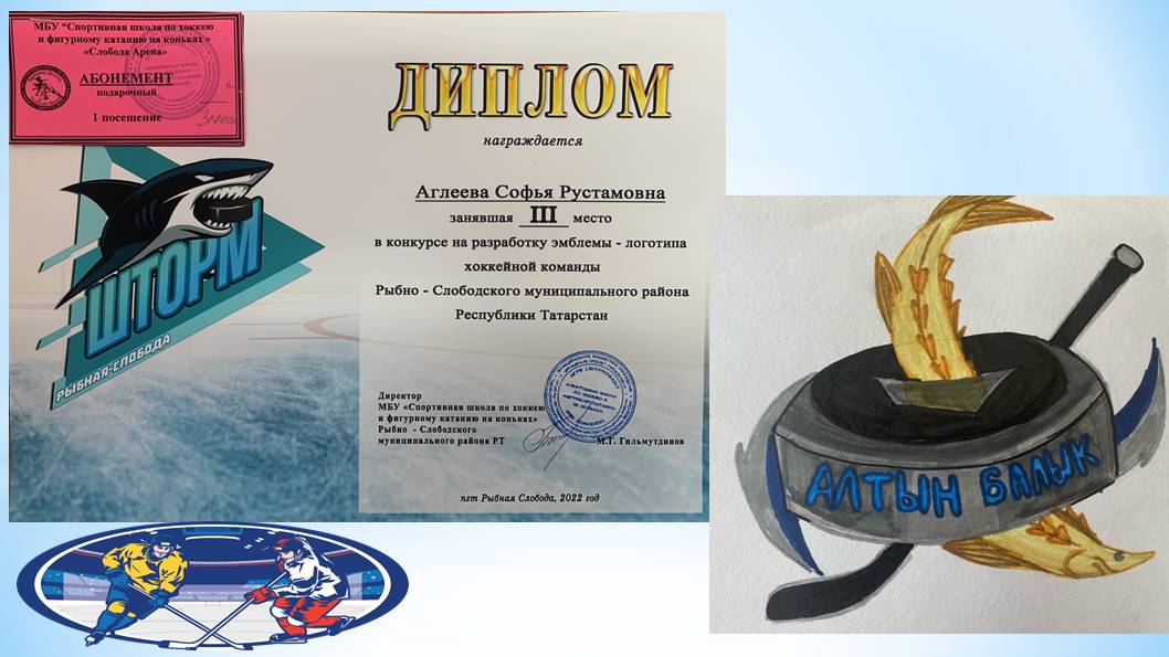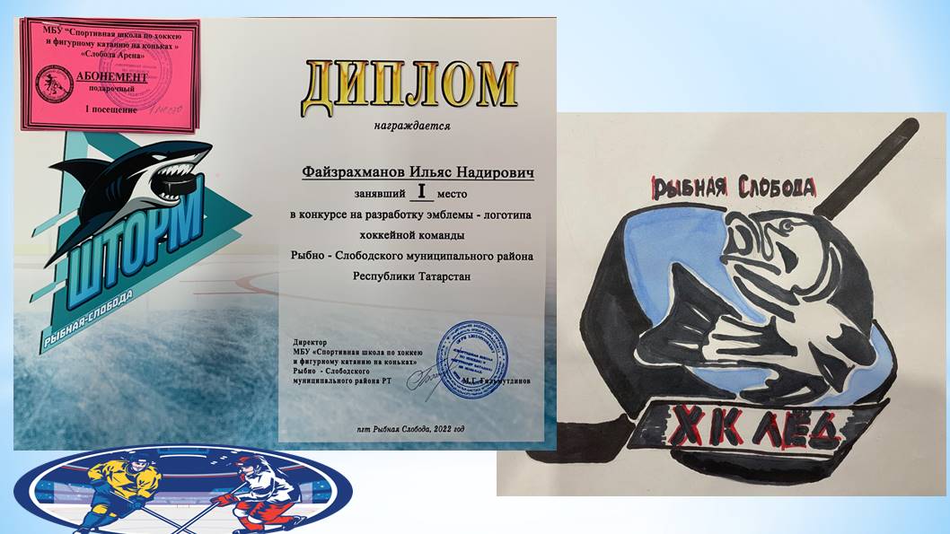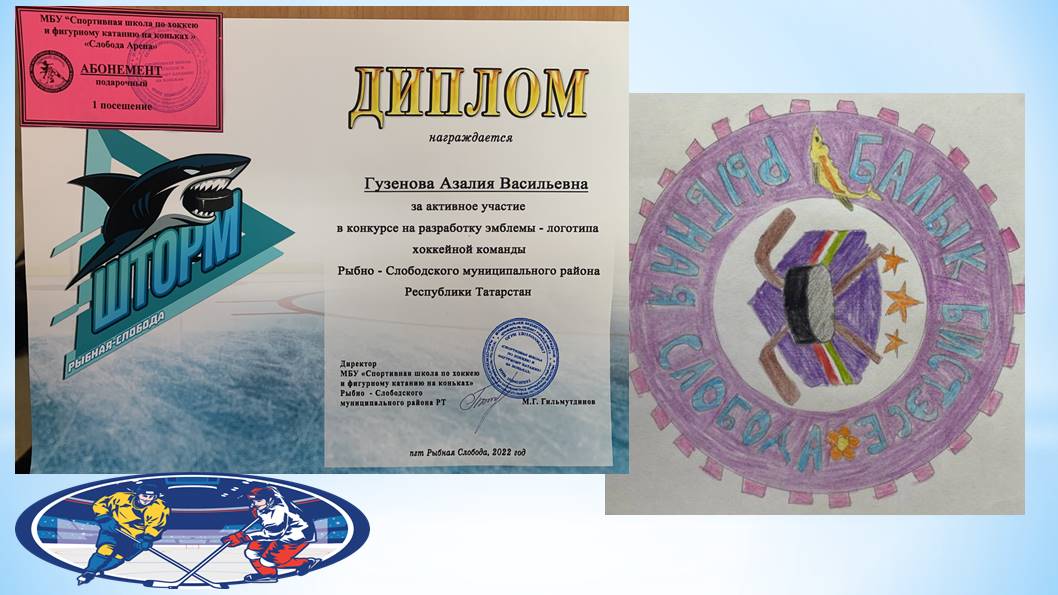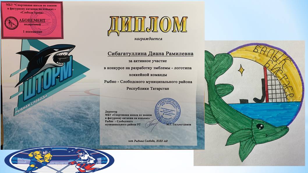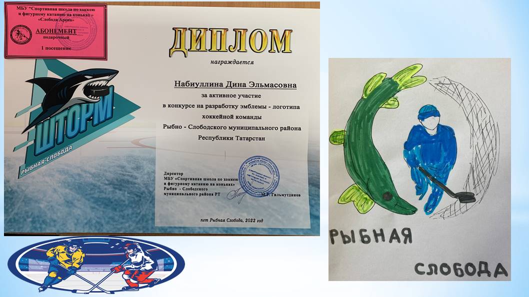 Безнең гимназия укучылары хоккей командасына эмблема-логотип эшләү буенча район конкурсында катнаштылар. Фәйзрахманов Ильяс 1нче урын, Әгълиева София 2 нче урын яуладылар. Барлык катнашучылар Боз сарае абонементлары белән бүләкләнделәр.