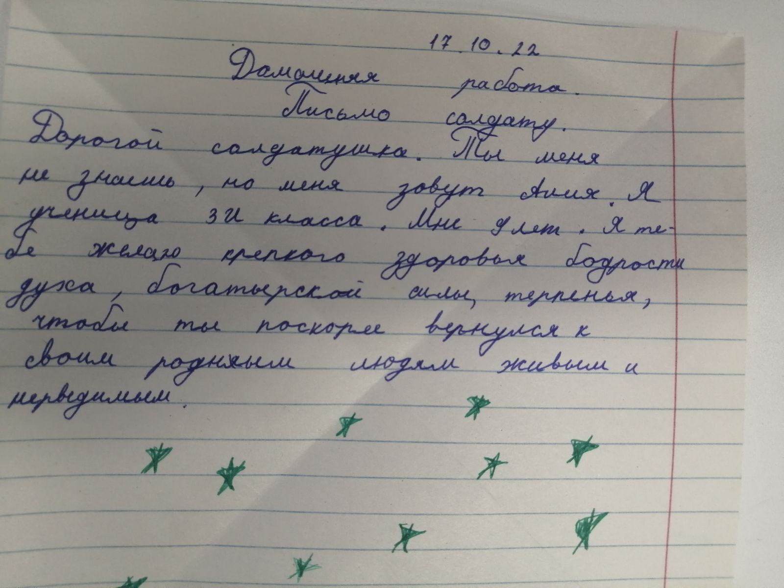18 октября в гимназии прошел Урок мужества. Целью его было ознакомление обучающихся с примерами героизма и мужества различных поколений защитников Отечества, оказание поддержки участникам специальной военной операции. В рамках этого урока учащиеся приняли участие во всероссийской акции «Письмо солдату». Они написали письма поддержки военнослужащим Вооруженных Сил, а также мобилизованным военнослужащим, проходящим подготовку и боевое слаживание. Как много чувств вложено в каждое письмо! Во всех письмах звучат искренние слова благодарности защитникам нашей свободы и безопасности и пожелания скорейшего возвращения домой живыми и здоровыми. Пусть каждое письмо дойдет до солдата и вселит в его душу уверенность в благополучном исходе.
