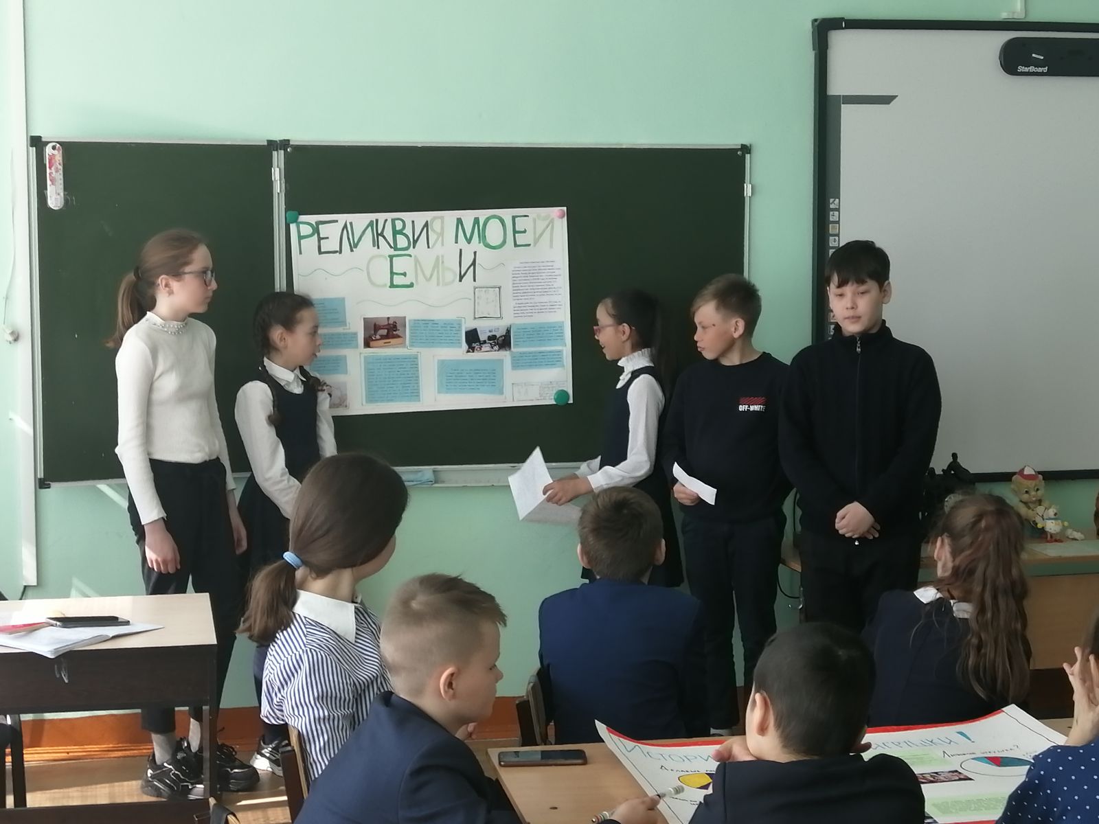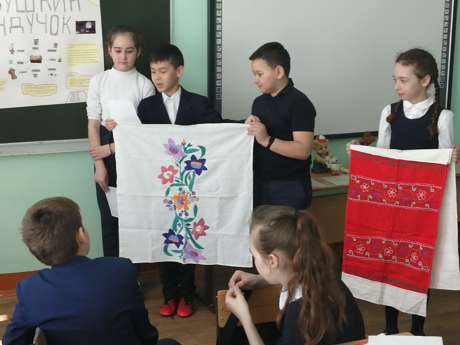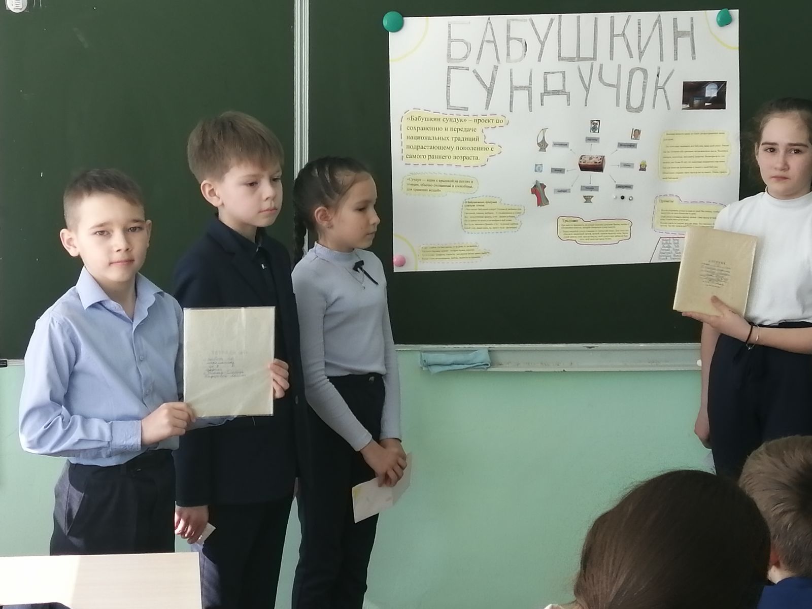 Все классы хорошо подготовились, собрали много интересного материала и интересно презентовали его. В ходе защиты ребята продемонстрировали свободное владение логическими операциями, навыками критического мышления, умение свободно отвечать на вопросы. Все проекты получили высокую оценку со стороны членов комиссии.Федераль дәүләт белем бирү стандартларын тормышка ашыруны тәэмин итү, метапредмет нәтиҗәләренә ирешү дәрәҗәсен бәяләү максатыннан, 6 нчы апрель көнне гимназиядә 4 нче сыйныф укучылары тарафыннан төркемле проектлар якланды.Һәр сыйныф үз темасын сайлады. Төркемнәргә бүленеп, укучылар проектны яклауга әзерләнделәр. 4нче А сыйныф бер гомуми теманы сайлаган: "Минем гаиләдә саклана...» .4 төркемнең һәркайсы үзенең темасы "Совет уенчыклары тарихы", "Минем гаиләм реликвиясе", "Әби сандыгы", "СССРда балалар оешмалары"турында сөйләде.