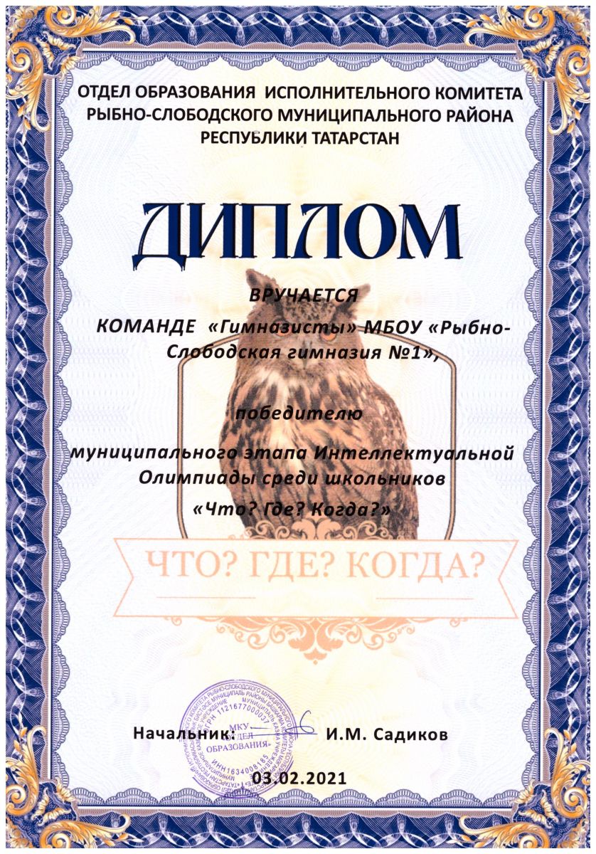 3 февраля на базе МБОУ «Центр детского творчества» состоялся муниципальный этап Интеллектуальной олимпиады школьников «Что? Где? Когда?», по результатам которой команда «Гимназисты» стала победителем. Гатиятуллина Эльвина, Файзерахманова Азалия, Нагимуллина София, Кадыров Рузаль, Бекеев Илья и Хазиев Алан с достоинством выдержали все испытания, ответили на самые каверзные вопросы и заняли первое командное место. Молодцы ребята! Виват, гимназия!3 февраль көнне Балалар иҗат үзәге базасында " Нәрсә? Кайда? Кайчан?аның нәтиҗәләре буенча» гимназистлар " командасы җиңүче булды. Гатиятуллина Эльвина, Фәйзрахманова Азалия, Нагимуллина София, Кадыйров Рүзәл, Бикеев Илья һәм Хадзиев Алан барлык сынауларны да лаеклы үтәделәр, иң катгый сорауларга җавап бирделәр һәм беренче команда урынын алдылар. Афәрин егетләр! Виват, гимназия!