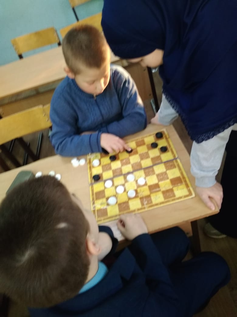 Ученики 4 В класса (классный руководитель Сагирова А.И.) на переменах состязаются в смекалке, сообразительности, логике. Именно эти качества развивает игра в шашки.